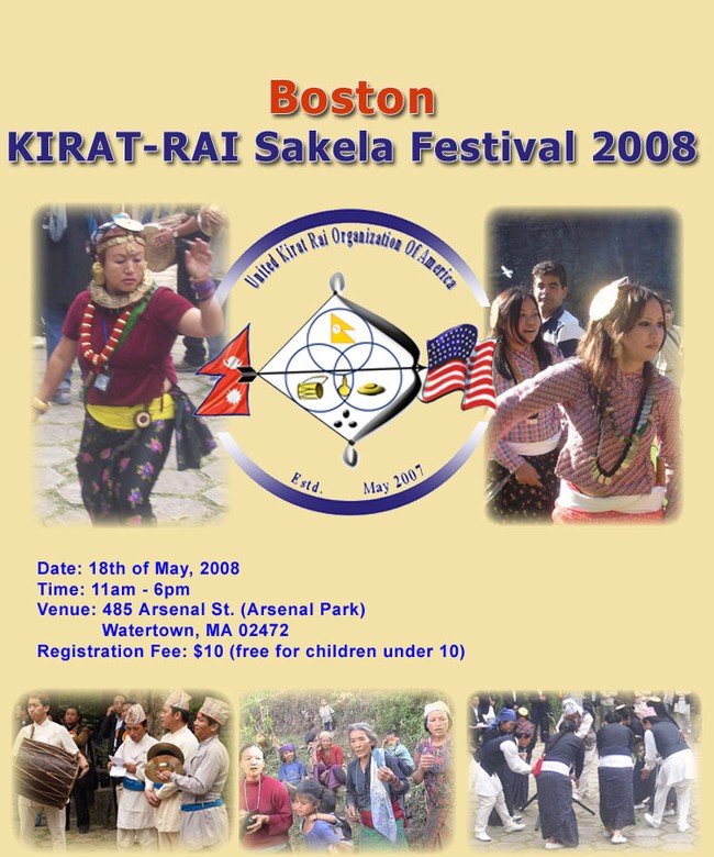 We are very please to invite all of you to the annual Kirat Rai traditional festival to be held in Arsenal Park, Watertown, Boston on May 18, 2008 to be organized by the New England Chapter of United Kirat Rai Organization of America (UKROA). This year all Kirat-Rai living in different states of America are going to gather in Boston to celebrate this auspicious occasion on this day by showing the great ethnic Kirat culture called “Sakela Dance”.