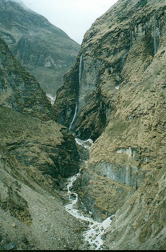 यो चाँही माछापुच्छ्रे आधार शिविरबाट उत्तरतिरको द्रिष्य। असंख्य झरनाहरुले मोदी खोलालाई सिन्चित गर्छन्।