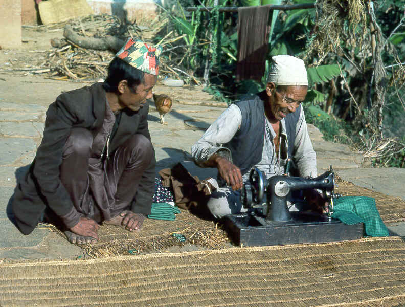 राजु दमाइका बा दसैमा जमुनीको चोलो सिलाउदै। छेउमा जमुनीका सोल्?टीको बाहून