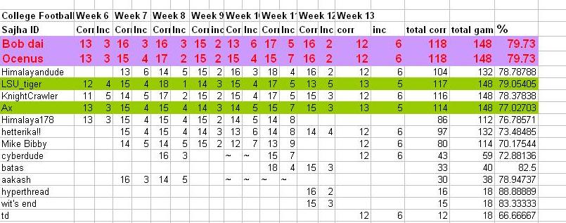 Here is mine too... #13 Rutgers at #15 West Virginia-----------------WV Connecticut at #6 Louisville-----------------------Louisville #17 Wake Forest at #22 Georgia Tech-----------Wake Fores Stanford at #18 California-------------------------California #2 USC at UCLA-----------------------------------USC #9 Arkansas at #4 Florida-------------------------Florida #20 Nebraska at #12 Oklahoma------------------Oklahoma #24Oregon State at #25 Hawaii------------------Hawaii
