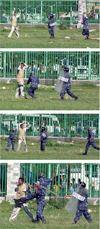 Nirman, Why don?t you not see their side of story and just bitch, yes just BITCH, about why they do things that may not please you or me. Apparently, you haven?t yet realized how many policemen have died for you, yet you just see some pictures captured by some journalist whose only job is to go to one of those protests and take the pictures when the police happen to beat some people. These policemen follow the orders from above no matter who is in power. Don?t you think they care about others? Do they beat people just for the fun of it? If you think we should beat those police --"ek ek samatera Thoknu parne"--how the f%*k are you any different from these policemen? Who is f@&*%g dumb here?? Moreover, I just said I have little or no sympathy to the guy; however, that does not mean that I fully approve of what the police was doing there.