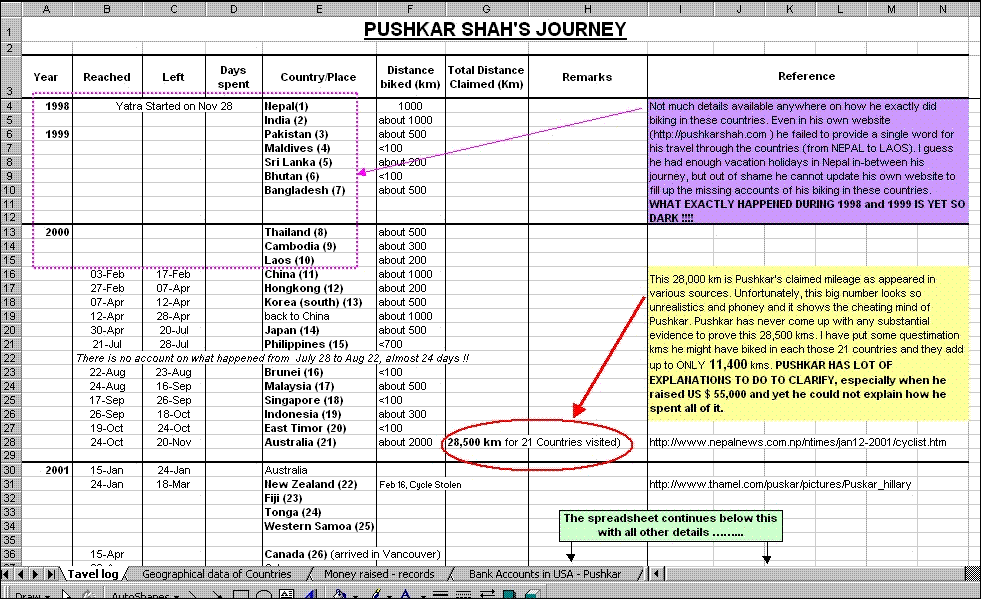 It looks like the people are making the subject of pride just to emphasize on where they stand about Puskhar Shah. I wouldn't believe it should be a matter of pride to present raw datas. I wouldn't worry even the data has some thousands + or - . The importance here is how someone can sacrifice 11 years just for cycling. It is certainly not a joke. Yes, name and fame comes to that person who has courage and determination. A good thing for Nepal. Personification of "Gurkha" is Puskhar Shah. Even if you have millions of dollars, you can't easily set a journey (of uncertainity) like that. Even if you love cycling, you can't bike 5-15 hours literally everyday for 11 hours. You need determination and real courage, and of course a Nepali maan. And, really, it needs a chokho Nepali maan to appreciate to someone, too! Or we would be a luchha bandar who can't see other's good doing!