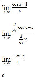 lim -(1-cosx) = ------------- x->0 x (-1) lim 1-cosx = ------------ x-->0 x = (-1) * 0 = 0