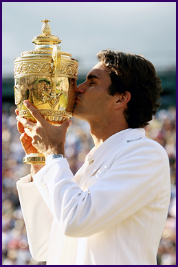 Roger Federer retained his crown as king of Wimbledon, beating young Spanish prince Rafael Nadal to secure his fifth consecutive title, matching the legendary reign of the watching Bjorn Borg, the king of this court in a previous era. The 7-6 (9-7) 4-6 7-6 (7-3) 2-6 6-2 victory he achieved followed a feast of tennis fit for any king. At three hours and 45 minutes, it was the third longest men's single final in Wimbledon's history and the most thrilling climax to the Championships since Goran Ivanisevic's dramatic victory in front of a raucous third Monday Centre Court crowd in 2001. Federer was at his very best, and he certainly needed to be to hold at bay the tigerish challenge of the Spanish 21-year-old. Last year Nadal lost here in four sets, this time he took the master of grass court tennis the full distance. And next year? In a breathtaking fifth set Nadal, who had undergone treatment to his right knee towards the end of the previous set, twice held two break points. If he had cashed in on either occasion surely he would have toppled the champion. But twice Federer rose magnificently to the challenge, fighting off the danger before he broke Nadal for what proved to be a crucial 4-2 lead. Yet at the start it had seemed Federer would be in for a straightforward coronation. He broke for a 2-0 lead in the opening set, only for Nadal to pull level and push it into a tie-break. Here a Federer trademark forehand and one of the 24 aces he struck in the match left him with three set points, only for the bounding Nadal to fight off all three and resist a fourth set point before Federer finally clinched it, by nine points to seven with a cross-court backhand volley, sparking a triumphant pirouette. Was Nadal downhearted? Never. He set about clawing back Federer's advantage, and did not need long to do so. Three aces got the Swiss out of trouble in the sixth game of the second set but, with a 5-4 lead, Nadal conjured an incredible backhand winner while in a seated position on the baseline. The startled Federer sent a forehand wide on the next rally to offer the challenger two set points, but he needed only one, levelling the match with a glorious backhand passing shot. As it has done to so many of his opponents, Nadal's relentless play seemed to be getting to Federer, but his ability to produce aces and spectacular winners kept him in front in the third set. As it moved towards another tie-break, Federer became involved in his longest match at this year's Wimbledon, though he took the tiebreak more easily this time, by seven points to three. Any thought that it might be simple from there on for Federer lasted as long as the opening game of the fourth set, Nadal breaking with a forehand service return which trapped the champion coming in. Another service break put Nadal in command at 3-0 but only after he had issued a Hawk-Eye challenge on a forehand called out. The system decided it was in by a whisker, provoking an eruption by the normally calm Federer. "How in the world was that ball in?" he asked umpire Carlos Ramos. "It [Hawk-Eye] is killing me today." There was hope for Federer in this otherwise bleak part of the match when Nadal called for treatment to his right knee, after which he was unable to jump off so effectively on his serve, but he held on to take the set and again level things after three hours seven minutes. Then followed the high drama of the deciding set. At 1-1 two Nadal errors saved Federer at 15-40. Then at 2-2 the champion again fell 15-40 behind but battled clear thanks to a Nadal error, followed by a crunching service winner. It provided the all-important breakthrough as Nadal then dropped serve to another of Federer's forehand specials With reason, the Swiss exulted. Federer sealed his initiative with three aces in the next game and Nadal, for once, had nothing left. He saved one match point on his own serve before, on the second, Federer hammered home an overhead smash and fell forward onto his face. Flat out maybe, but Wimbledon's winner for the fifth time. Admiring it all from the Royal Box was Bjorn Borg, who was crowned here every year from 1976 until 1980. The two men are now level in the Wimbledon record books but next year will it be King Roger VI? Written by Ronald Atkin