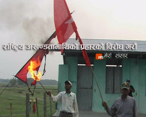 These Madeshi are Nepali too.  And so called madeshi leader didn't spoke a word against them. Mind you this flag was burnt on their so called madeshi andolan.