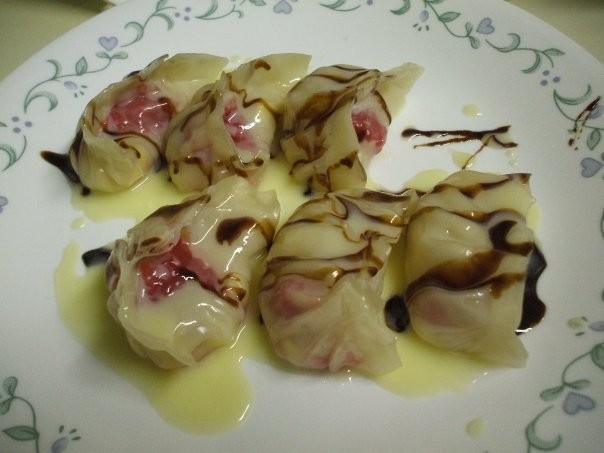 FILLED WITH WHITE CHOCOLATE AND RASPBERRIES IN A REGULAR FLOUR SKIN AND STEAMED IN A CONVENTIONAL WAY.