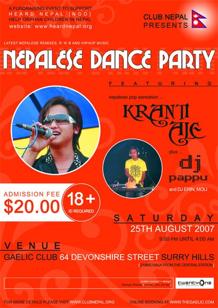 Featuring: Kranti Ale, Dj Pappu(resham), (electro/house,nepalese remix,hip hop n rnb) Dj Erin and Moli. (hip hop n rnb) Venue: Gaelic Club, 64 Devonshire Street,Surryhills. Tix: $20 (+18 ID required).