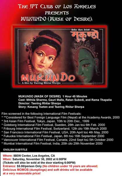 JPT Club of Los Angeles presents MUKUNDO is a stormy and sensuous exploration of shamanic ritual, female desire, and forbidden love in modern-day Nepal. Tsering Rhitar Sherpa delivers a refreshing portrait of modern Nepal, one in which mysticism is treated as a basis aspect of everyday line not as a special effect. The movie breaks industry barriers as well as traditional narrative and thematic convention. The movie was short listed for the 2000 Foreign Language Oscar. Film will be screened with ENGLISH SUBTITLE. WHERE: IBEW Hall 8333 Airport Blvd, Los Angeles, CA 90045 WHEN: Saturday, November 30th, 2002 at 6:00 pm (Tickets will be sold at the door starting 6:00pm) ENTRANCE: $5.00/person only (No children under 10 years are allowed) Delicious MOMOS (dumplings) and soft drinks will be available at a very reasonable price! 'Please RSVP before 25th November, MONDAY.' LIMITED SEATING. DIRECTION: From 405 Fwy, Exit at La Tijera Blvd. Go WEST. Make LEFT on Airport Blvd. The IBEW Hall in the only building on Right Hand Side. Go inside the gate and park in the back. There will be some sign posted outside the building. TICKET & CONTACT INFORMATION: Dhiraj Lama dhirajx@hotmail.com Lamu Stadler 562.594.5726 Sabina Pradhan 310.978.4573