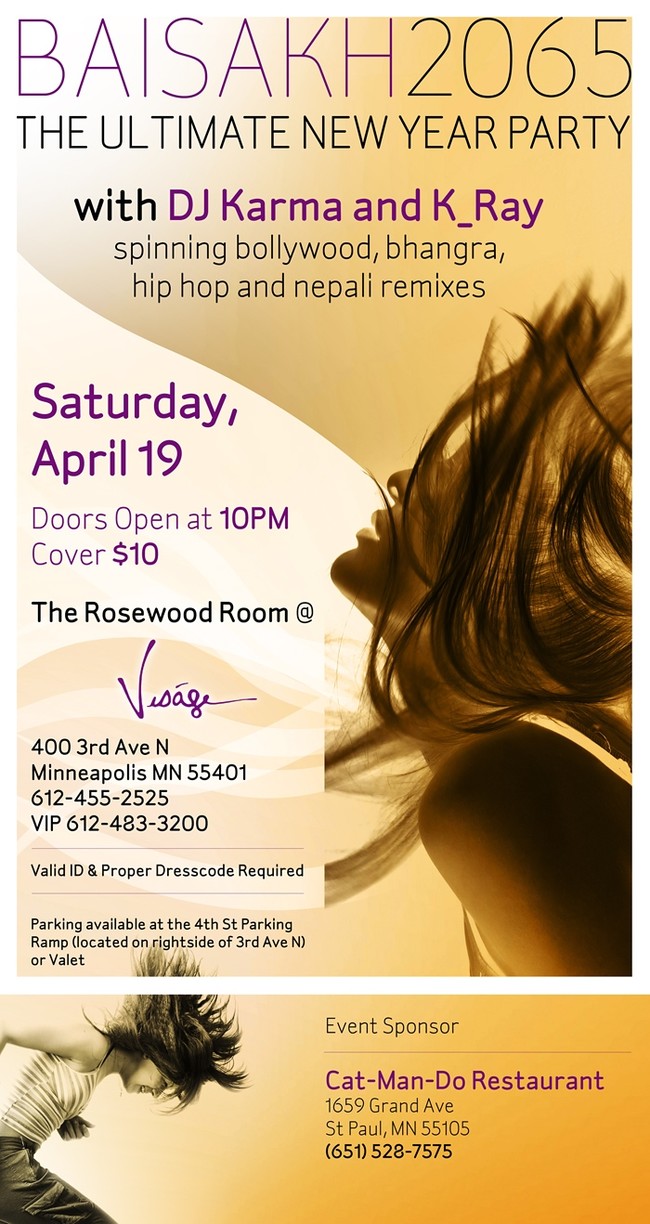 Please celebrate the 2065th Nepali New Year with DJ Karma and K_Ray @ Rosewood Room @ Visage on Saturday, April 19th. They will be spinning the latest in bollywood, bhangra, hip hop and Nepali remixes!!