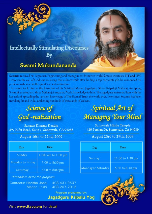 Swami Mukundananda, a Senior Disciple of Jagadguru Shree Kripaluji Maharaj, will give a series of speeches on the Science of God-Realization. Learn how to meditate on the form of personality of Godhead and deepen your understanding of devotion to God. Swami Mukundananda received his degrees in Engineering and Management from two of the world’s most elite educational institutes-Indian Institute of Technology (IIT) and Indian Institute of Management (IIM). However, after landing a top corporate job, he renounced his professional career to take sanyas, in the quest for God-realization.