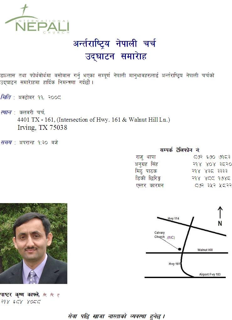 Please join us for the  grand opening of International Nepali Church in Irving, TX. Pastor Krishna Kafle who has been in the ministry for more than 16 years has started a church to serve all nepali speaking communities in Dallas, TX. He has been living here in USA for more than 10 years with his wife and three children. His educational background includes theological training in Master of Divinity  and secular study in Science (B.Sc) and Business study (BBA, MBA) from US and Canada. He also holds professional license of CPA (Certified Public Accountant) . Everyone is invited in this Grand opening ceremony. There will be refreshment after the service.