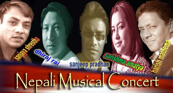 SOUTHERN CALIFORNIA NEPALI GROUP PRESENTS Dear Friends and Family, Our renowned top Nepali singers and Musicians are performing musical night this coming 8th May 2005 in Los Angeles. We would like to invite all of you so we all can enjoy perfect Nepali musical journey. Let?s help these Nepali talents who are here all the way back from our home (Nepal) to perform musical concert for us. List of the artists and songs: Sanjaya Shrestha: maya meri maya, anjan mayalu, tadha najaideu, lets rock etc. Harish mathema: swapnil rangma, ankhako nani hau timi, mohani layo malai, kehi sodhoen timilai etc. Sanjeep pradhan: nasha vitra nasha sari, deuraliko chautarima, sirima siri, kasari bhanuma etc. Dhiraj rai: luki luki, misterious girl, soee dholay soee, timra nayan etc. Sarishma amatya: ma timila maya gardachu, ya ta timi pani, o mero priyatam, etc. Pricing: DONOR Seats: $100 VIP Seats: $35 General Seats: $15 Tickets are only available at Concert hall. (Cash only please) VENUE: City of Carson - Community Center 801 E. Carson St. Carson, CA 90745 Date: 8th May 2005 Time: 8:30 PM For more information contract: Lamu Lama-562-5945726 Jitendra Amatya-818-777-3080 Samir Thapa-626-833-2239 Ganga Shrestha-818-601-7659 Gunja Pradhan-310-902-6407 Anuj Pradhan-310-415-3027 Gokul Poudyal-818-884-5813, 818-312-7054(C)