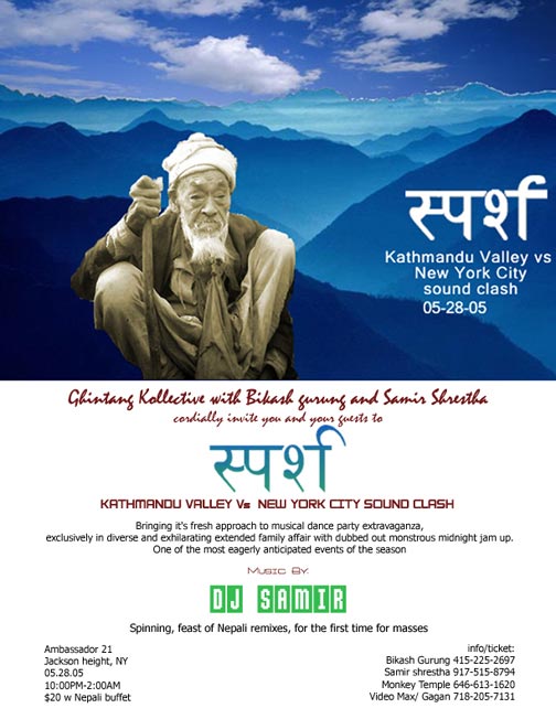 May 28th, 2005 Saturday 10:00 PM - 2:00 AM Event: Dance Party with Nepali Dinner: Ghintang Kollective with Bikash Gurung and Samir Shrestha cordially invite you and your guests to "SPARSHA: Kathmandy Valley Vs New York City Sound Clash" Price: $20 with Nepali Buffet Location: Ambassador 21, Jackson Height, New York Tickets: Bikash Gurung (415) 225-2697 Samir Shrestha (917) 515-8794 Monkey Temple (646) 613-1620 Video Max/ Gagan (718) 205-7131