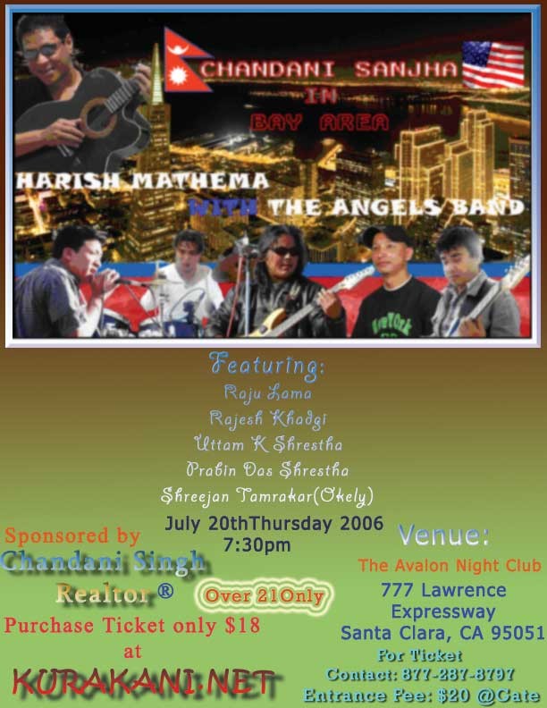 Dear Friends & Family, Our renowned and extremely talented Nepali singers and musicians will be performing a concert on July 20th Thursday @ Avalon Night Club, Santa Clara. at 7:30pm!! for more info click the link below: http://www.chandanisingh.com/concert/concert.pdf or view the attachment!! THIS IS NOT ALL: DON'T FORGET THE AFTER PARTY WITH DJ ...& OUR NEPALI ARTIST COME PREPARE TO ROCK AND ROLL WITH THE GREAT MUSIC... Location Club Avalon 777 Lawrence Expressway, Santa Clara, CA 95051 Ticket: $20 at the gate! Advance booking: $18 TO BOOK YOUR TICKET ONLINE VISIT www.kurakani.net NOW!!! Info call 877-287-8797 or 510-825-8500