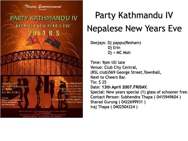 Nepalese New Years Eve Party. Here in the heart of sydney with heaps of entertainment. One of the hottest favourite Nepalese and Western deejays on town are going to spin there favourite tunes to make you bang your feets that night. Deejay featuring----Dj Pappu(Resham), Dj Erin and Dj+Ec Moli. Lot more entertainment will be included folks. Can't wait - can't wait.