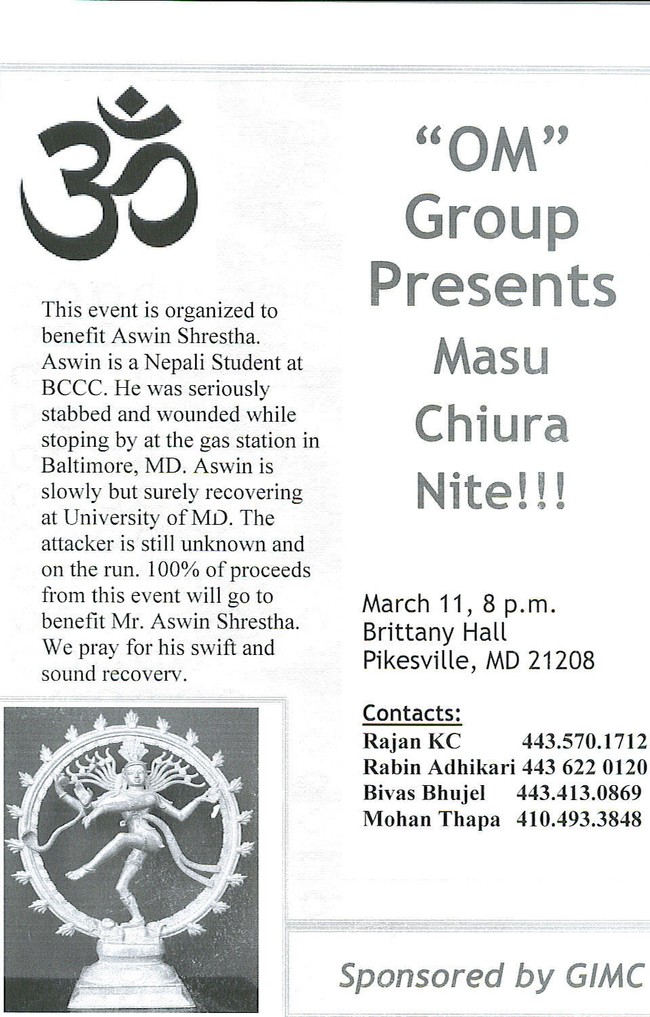 THE "OM" GROUP Presents Masu chiura nite Date March 11 2007 Time 8:pm Brittany hall Pikesville,md 21208 Contacts: Rajan K.C. 443 570 1712 Rabindra Adhikari 443 622 0120 Mohan Thapa 410 493 3848 Bivas Bhujel 443 413 0869
