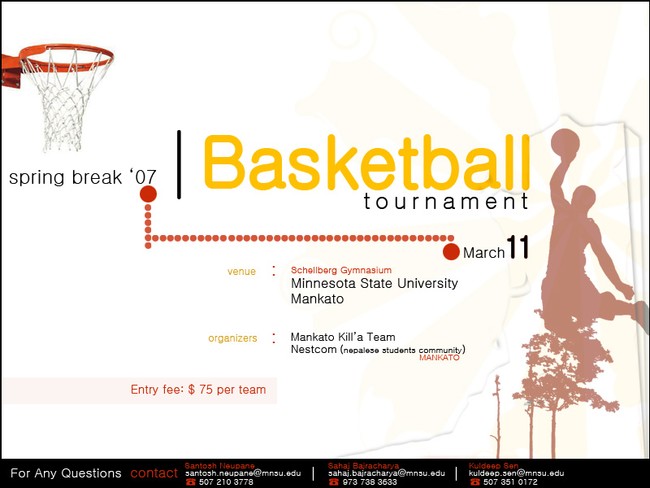 There is going to be a Basketball Tournament held at MSU coming spring break '07. It will be co-organized by Mankato Kill'a Team and Nestcom.